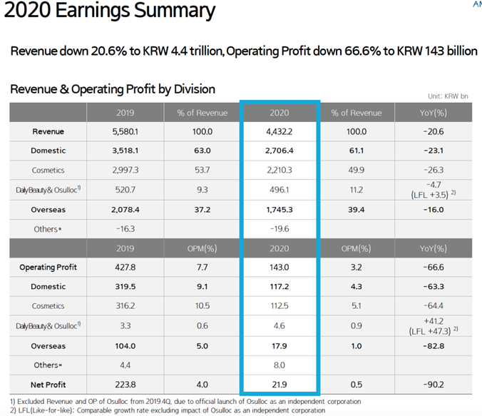 根据爱茉莉太平洋集团发布的财报显示,2020年其营业收入下滑21.5%至4.9万亿韩元(约合人民币282亿元),营业利润下滑69.8%至1507亿韩元(约合人民币8.7亿元)。