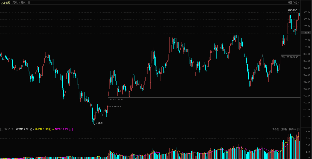 伴随着全球人工智能的快速发展,也出现了不同的声音,也有批评和地址的观点,而人民日报这篇文章已经表明了态度,这也确立了人 工智能还会是中长期的赛道之一,技术走势来看,人工智能板块已经创出了新高,周线来看持续放量。短期来看,6月21日出现了一颗 高位放量中阴线,短期依然是有调整需求的,但是中期来看还是有机会的。未来板块会出现分化,一些龙头品种会演变为白马股的走势,需要找一些有业绩支撑的龙头个股。