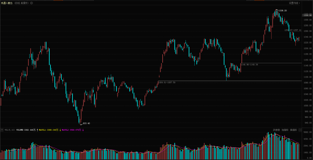 机器人板块从22年10月份到23年7月份是走了一波中期震荡反弹行情,这一波反弹是跟随科技板块起来的,但是整体涨幅来看是明显小于科技板块的,近期的资金关注点都在券商和地产等权重板块,中小市值板块遭到了冷落,机器人也是一波快速调整,目前到了支撑区域尝试做止跌,这个位置是有就会起反弹的,机器人板块可以保持关注。