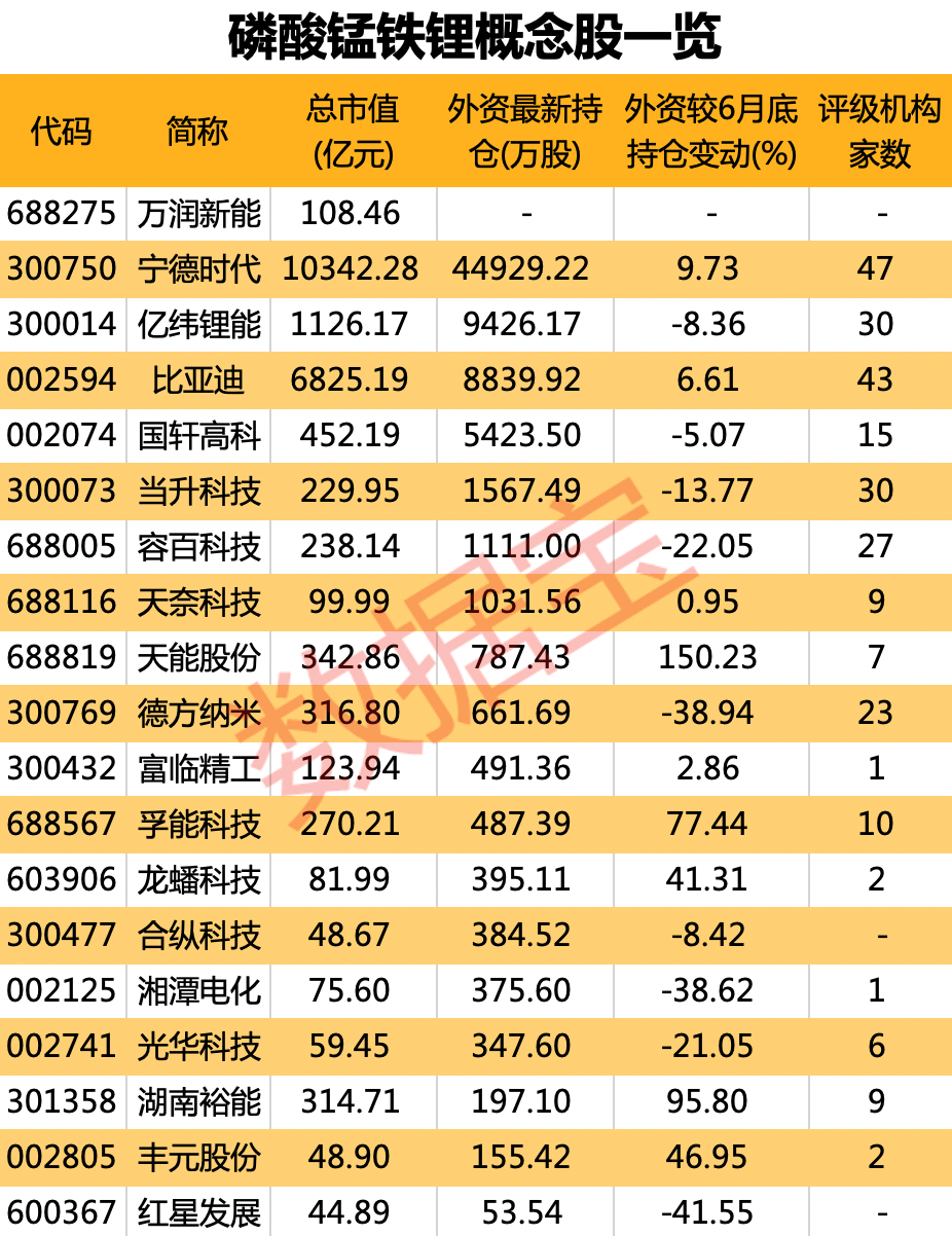 证券时报·数据宝不完全统计,A股市场中布局有磷酸锰铁锂业务的上市公司,共计19家。其中,机构关注度比较高的有宁德时代、比亚迪(002594)、亿纬锂能(300014)、当升科技(300073)、容百科技(688005)、德方纳米(300769),参评机构均超20家。