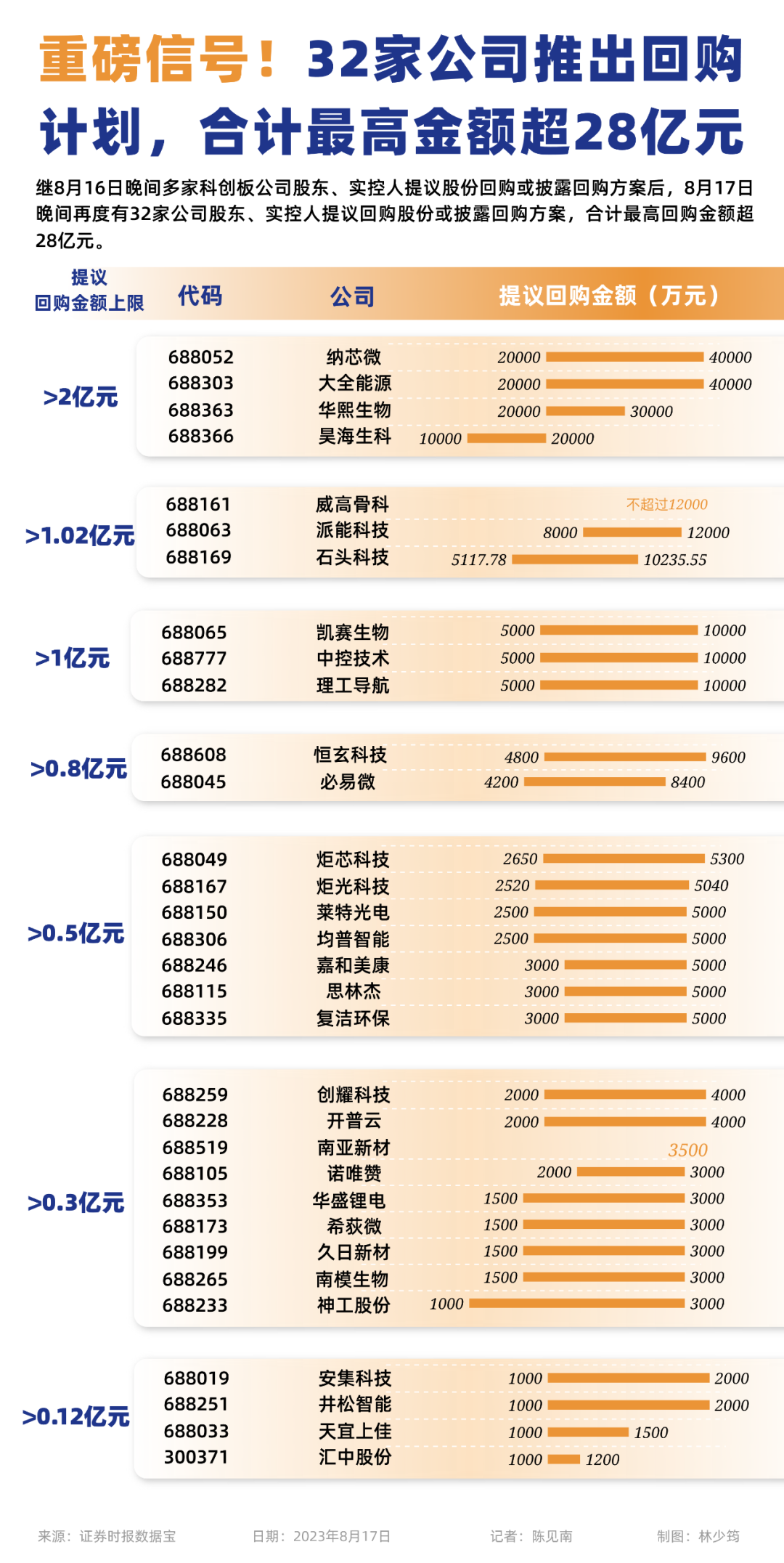 继8月16日晚间多家科创板公司股东、实控人提议股份回购或披露回购方案后,8月17日晚间再度有32家公司股东、实控人提议回购股份或披露回购方案。其中派能科技、大全能源、纳芯微、中控技术、威高骨科等个股拟回购最高金额均在亿元以上。