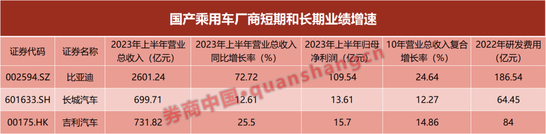 比亚迪、长城和吉利今年上半年的营业收入合计为4000亿元,已占到我国上半年乘用车销售总额的五分之一,并且它们仍以极快的速度在奔跑。如果从过去十年的维度看,我国头部汽车公司每年保持了10%以上的营业收入增速。