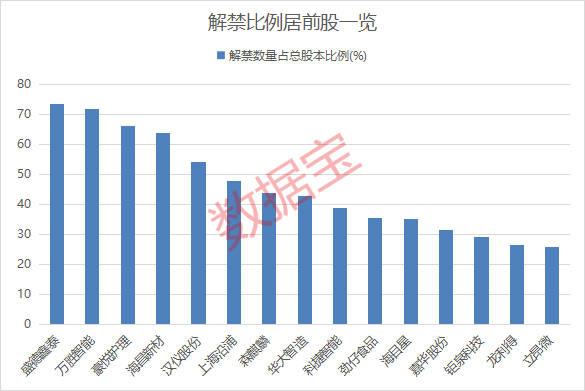 解禁比例来看,盛德鑫泰、万胜智能、豪悦护理等5股的解禁股数量占总股本比例超50%,其中盛德鑫泰的解禁股比例最大,达73.5%。金宏气体、汇纳科技、石头科技等16股的解禁比例较小,均不到1%。