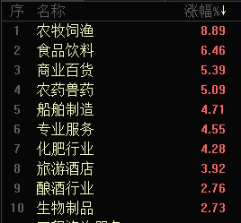 板块方面,农牧饲渔板块以8.89%的整体涨幅领跑A股,板块内43只个股涨幅超过9%。河南两家农业板块的上市公司秋乐种业、花溪科技均30CM涨停。食品饮料、商业百货、农药兽药等板块涨幅靠前。