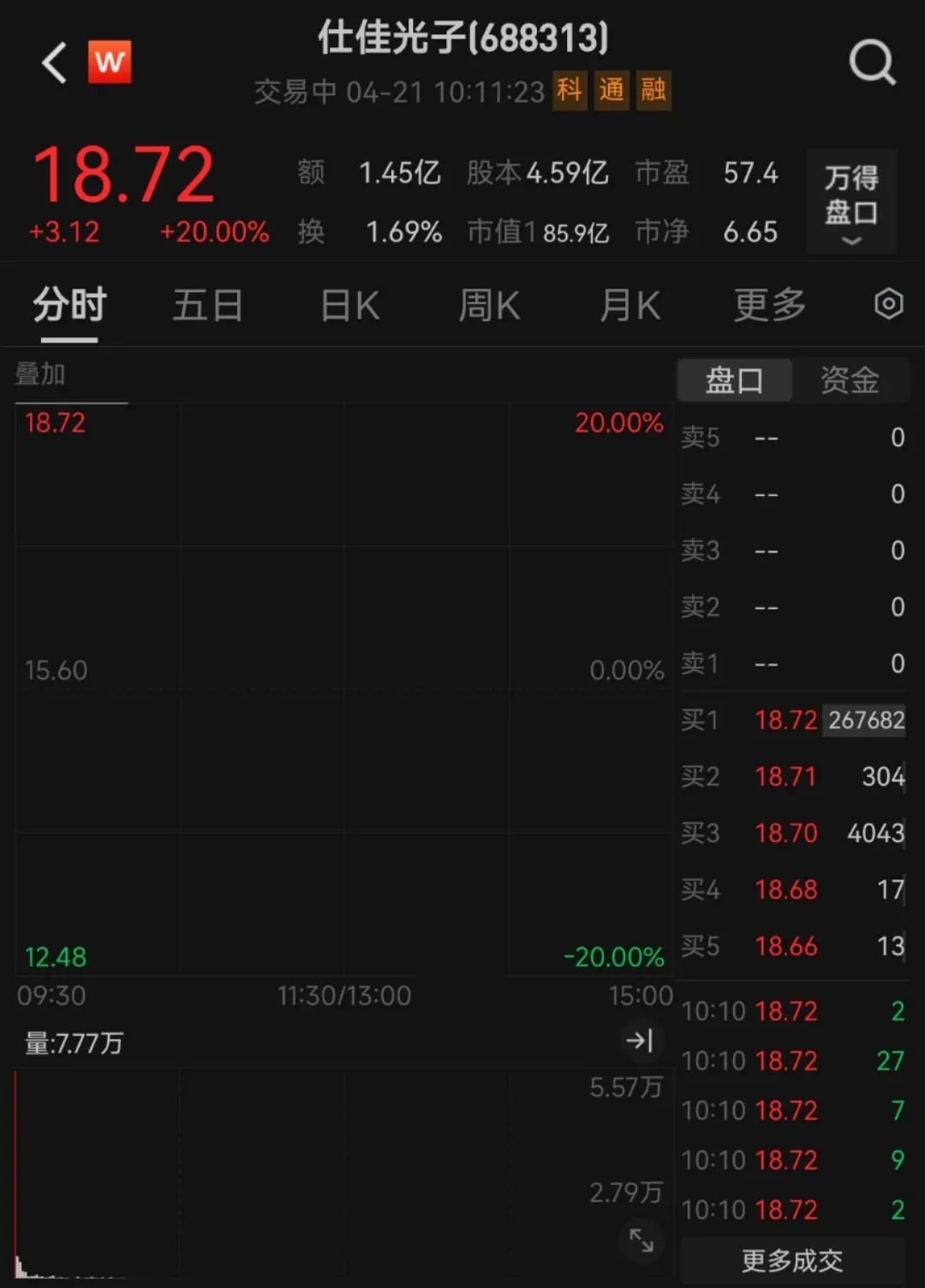 热点方面,河南上市公司仕佳光子20%涨停。4月18日,仕佳光子发布2024年年度报告和2025年一季报。2024年公司实现营业收入10.75亿元,同比增长42.40%,归母净利润0.65亿元,同比增长236.57%。2025年一季度公司实现归母净利润9319.44万元,同比增长1003.78%。