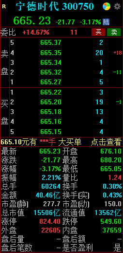 12月6日,宁德时代(300750,股吧)盘中跌超3%。截至发稿,股价报665.23元,成交额40.46亿元,最新市值15506亿元。