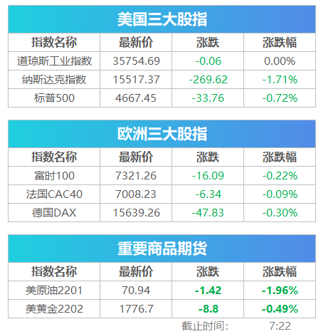 科技股普遍下跌,互动健身平台Peloton跌超11%,特斯拉跌6.1%,超威半导体跌4.9%,英伟达跌4.2%,莫德纳、ASML跌3.9%,Zoom跌3.3%,奈飞跌2.7%,亚马逊跌超1%。由于三季度业绩不振,游戏驿站大跌10.3%。