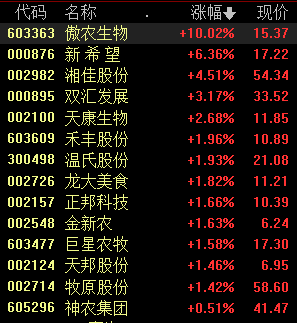 1月5日早盘,猪肉板块震荡上扬,截至发稿,傲农生物(603363)涨停,新希望涨逾6%,湘佳股份、双汇发展(000895)、天康生物(002100)等多股纷纷跟涨。
