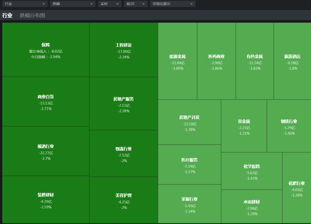 通过热力图跌幅榜来看,今天跌幅靠前的是保险、商业百货、酿酒行业、装修建材、工程建设、房地产服务、物流行业、美容护理等。消费板块中的商业百货、酿酒行业短期连续反弹之后出现了调整走势,对于消费板块这几个细分行业都是按自己中期节奏去走的,这也是正常技术性调整,问题不大。而保险板块今天这一颗中阴线对于指数影响较大,保险板块虽然个股数量不多,但一直以来都是行情的风向标,今天低开低走呈现震荡下行走势,并且日线来看这一颗阴线破坏了小幅反弹的结构,也逼近了前期低点,保险能否止跌反弹也是非常关键。