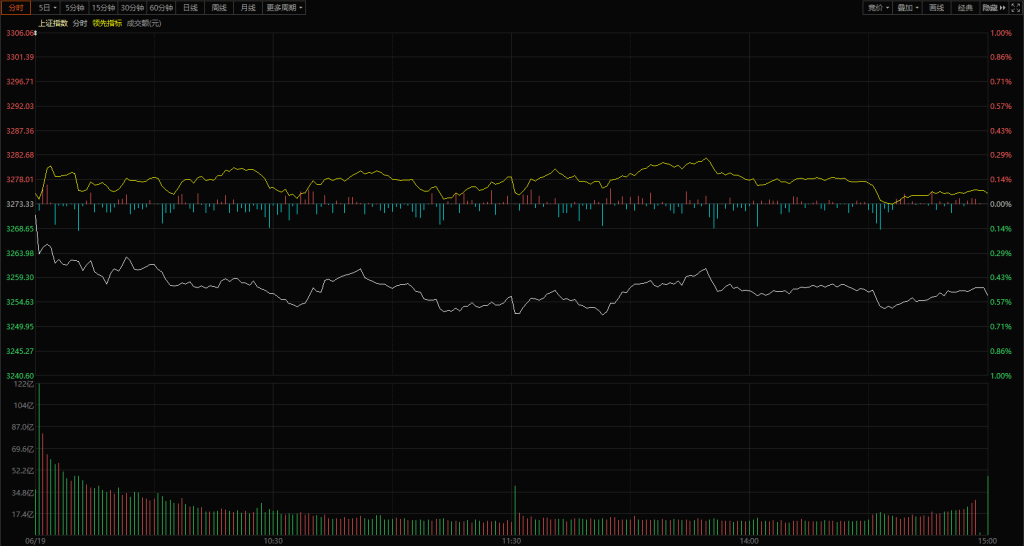 【市场走势】2023年6月19日星期一,市场今天表现为低开低走震荡下行,从品种分类上看:中字头权重股主动调整,白线重心一直下移;而中小市值题材表现活跃,受指数影响不大。资金面上今天央行净投放了870亿资金,这么大的资金为什么指数不涨呢,这里一个很关键的因素,6月底历年以来都是上半年资金缺口最大的时间窗,央行这里投放资金更多的是为了对冲市场的钱紧。