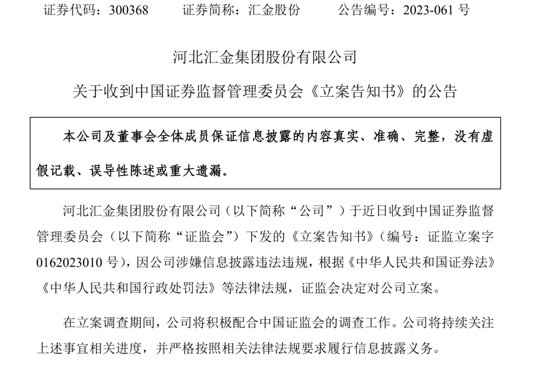 又一家上市公司遭证监会立案调查,7月28日晚间,汇金股份(300368)(300368)公告称,公司于近日收到证监会下发的《立案告知书》,因公司涉嫌信息披露违法违规,证监会决定对公司立案。