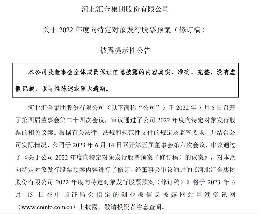 今年6月15日,汇金股份披露了2022年度向特定对象发行股票预案(修订稿),根据该预案,公司拟向控股股东邯郸建投发行股份募集资金总额不超过1.98亿元。目前,邯郸建投持有汇金股份的股权比例为28.93%,若本次发行顺利完成,邯郸建投持股比例将升至33.20%。