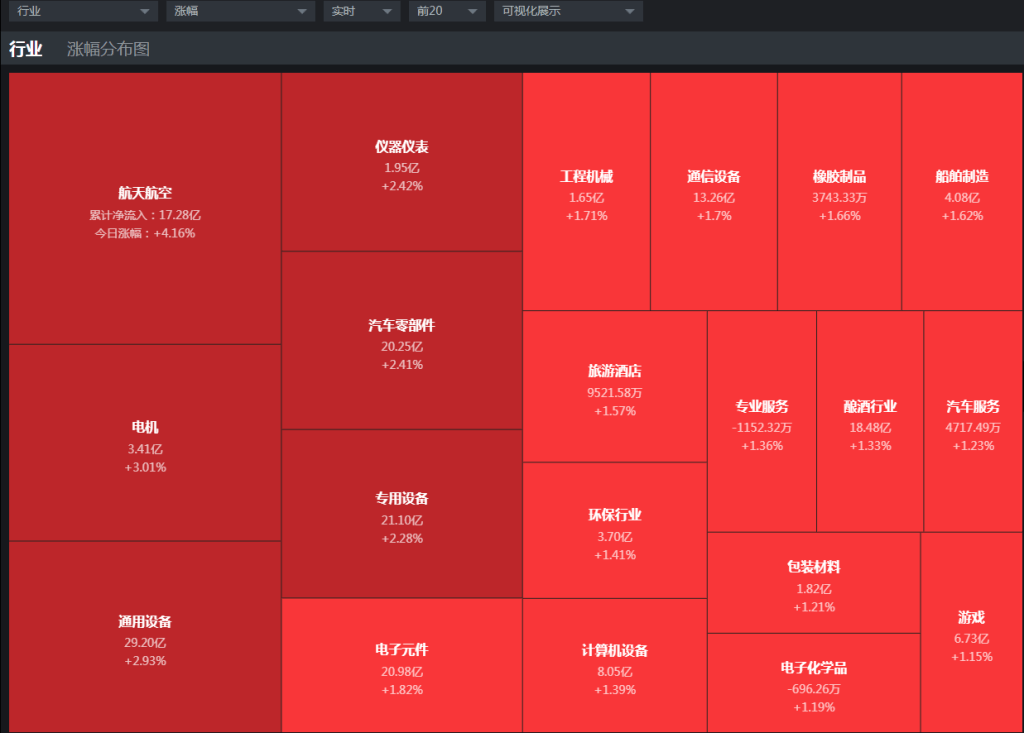 【热点板块】今日板块热力图来看,涨幅靠前的是航天航空、电机、通用设备、仪器仪表、汽车零部件、专用设备、电子元件、工程机械、通信设备等。四维分析来看,两市上涨板块是76个、形成了普涨的格局,涨幅超过2%的有6个板块,个股方面,沪深两市上涨家数是3989家,涨停43家,下跌家数是1102家,跌停1家。板块和个股数据来看,板块和个股上涨家数都是创出了近期的新高,终于迎来了一次普涨的格局,虽然今天指数上涨幅度并不大,但是板块和个股的活跃度出现了提升,当然这样的势头能不能持续是下一个阶段关注的重点。今日热点主要是两个方向,第一个方向是航天航空,航天概念、大飞机概念、无人机、军民融合等都是涨幅靠前,以航天航空为例,今天是收出了一颗放量长阳线,这一颗长阳线吞掉了前面9颗K线,从K线和技术形态来看这是比较强的一种走势,但比较遗憾的是航天航空没有一只涨停的个股,也就是目前没有形成集体进攻的信号,还需再观察。第二个方向就是机器人(300024),电机、机器人执行器、减速器、工业母机等都是机器人方向的炒作,机器人概念从中期角度来看,是一个震荡上扬的结构,每一个小波段走的都是比较清晰的,形成底底抬升、顶顶抬升的走势,并且机器人相关概念涨停的比较多,今天涨停43家,大部分都是机器人相关的品种,从短期赚钱效应和强度来看机器人是最值得关注的。
