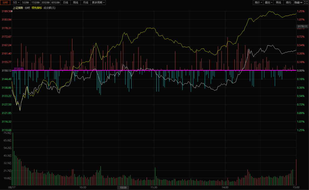 【市场走势】今天是2023年8月17日星期四,上证指数在早盘跌破3150点之后迅速破底翻,黄白两线共振反弹,10点半之后小盘股反弹加速,午后经过短暂震荡之后尾盘再次发力,最终指数收在3163点,成功保卫住3150。