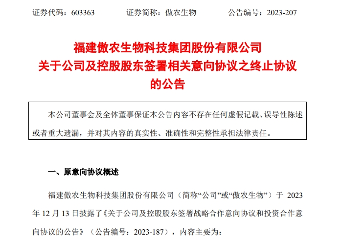 回溯前情,傲农生物、大北农12月12日晚间双双公告,大北农与傲农投资签署了《投资合作意向协议》,并与傲农生物签署了《战略合作意向协议》。(此前报道:同行出手!这家猪企或将易主)