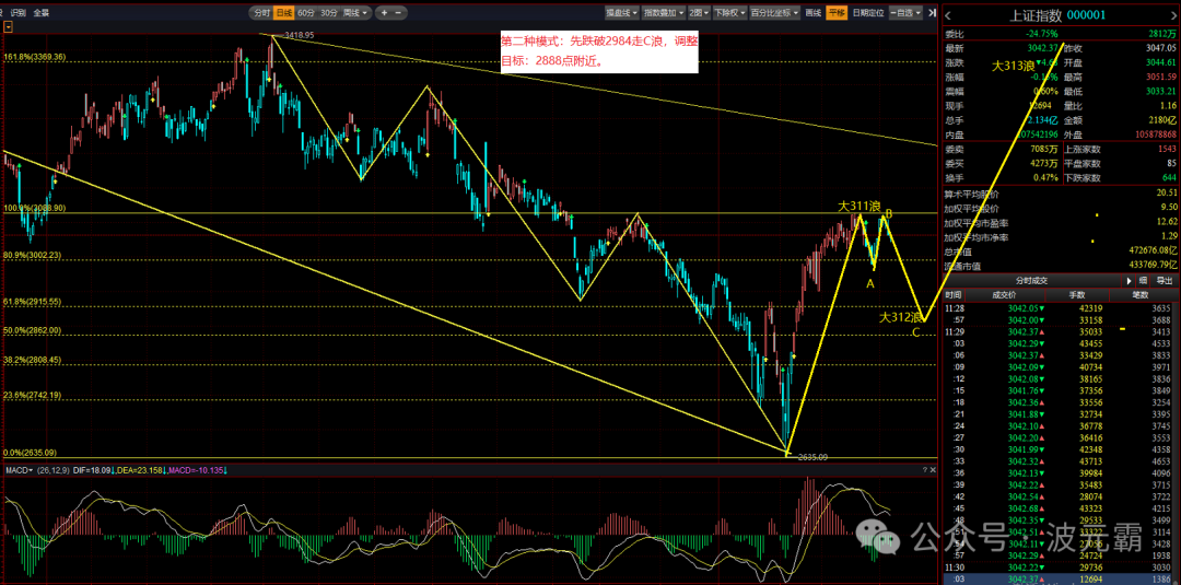 ②若市场走大312C浪主跌,首先需跌破2984.12点,随后2943点也将失守,目标位在2888点附近。具体走势需根据细微浪型进行预测。走势图如下: