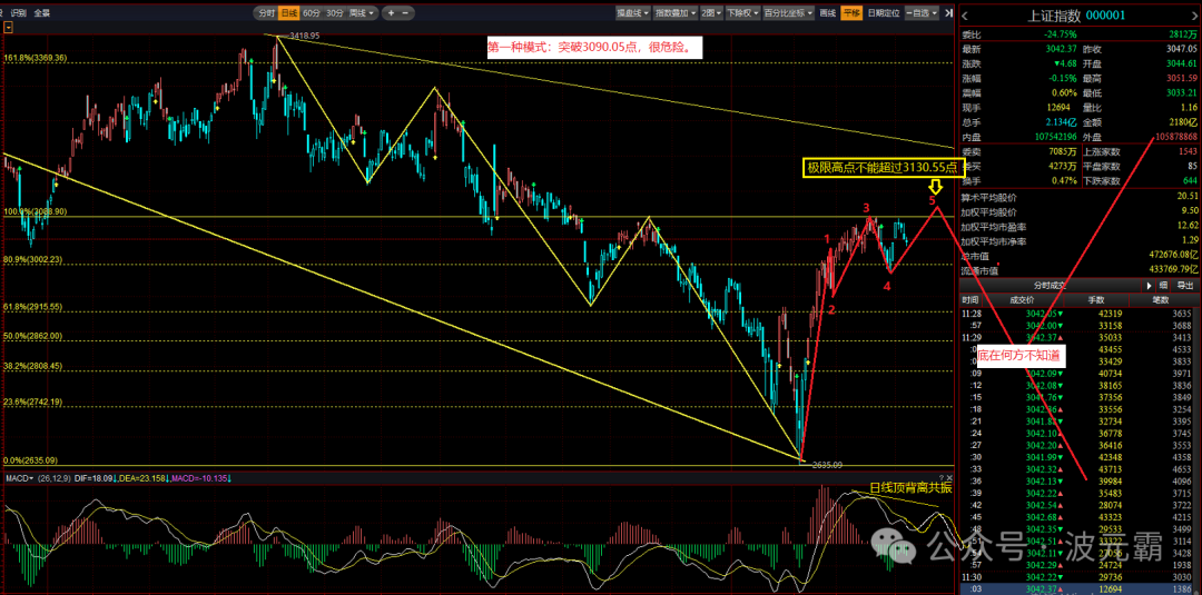 此走势风险较大,若为微5浪末浪上升,极限高度不会超过3130.55点。关键问题是,一旦日线顶背离共振构筑成功,市场可能跌破2635点。目前先不考虑是否创新低,后续走势将逐步验证和修正。