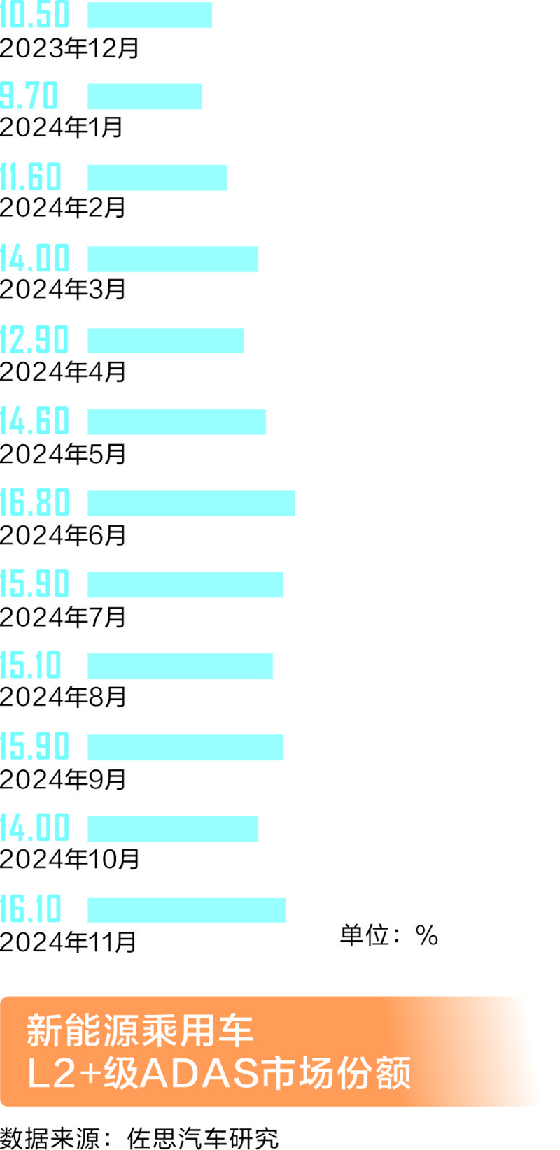 从市场方面看,消费者对于高阶智驾的接受度也较高,L2级以上ADAS市场份额呈现出逐步攀升态势。根据佐思汽研数据,2023年12月至2024年11月,中国新能源(600617)乘用车市场L2级以上ADAS整体装车率逐步扩大,市场份额由10.5%一路走高至16.1%。