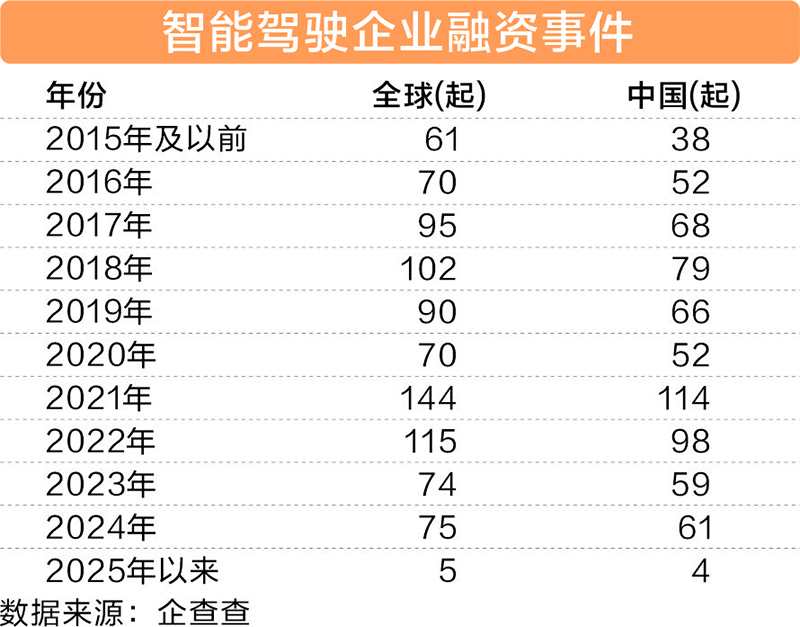 企查查数据显示,全球自动驾驶行业融资事件从2016年开始每年均保持在70起及以上,2021年、2022年达到高点,融资事件分别为144起、115起。