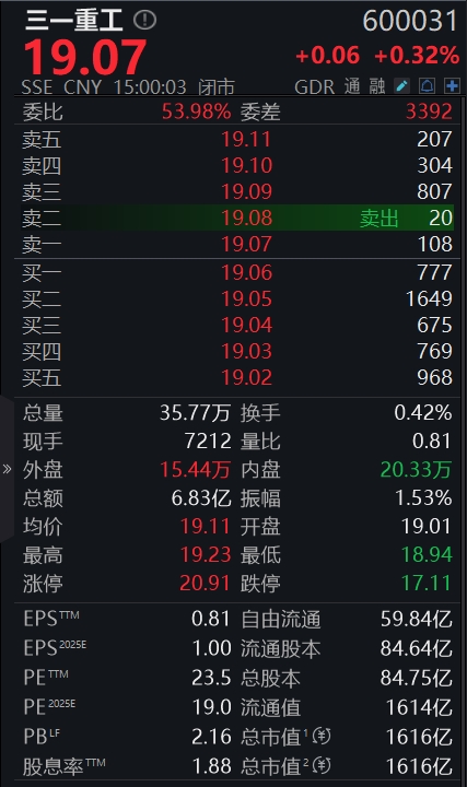 最新一期业绩显示,三一重工一季度实现营业收入210.49亿元,同比增长19.18%;归母净利润24.71亿元,同比增长56.40%。截至今日收盘,三一重工股价报19.07元/股,总市值1616亿元。