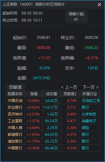 8月5日,市场全天震荡走高,沪指重回3600点上方,再创年内收盘新高。截至收盘,沪指涨0.96%,深成指涨0.59%,创业板指涨0.39%。