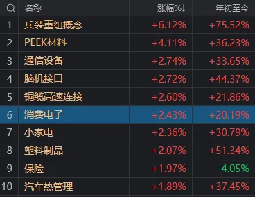 高位股的大涨,也令机器人板块情绪继续昂扬,PEEK材料、铜缆、汽车零部件等细分板块纷纷大涨。
