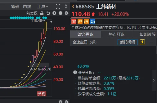 今日开盘后,上纬新材仅短暂翻绿便再度大涨,尾盘20cm涨停;最新股价达到110.48元,总市值445.63亿元。