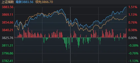 但或许是3万亿元的量能给了市场信心,午后,三大指数竟再度上攻,沪指收于日内最高点(3883.56点)。