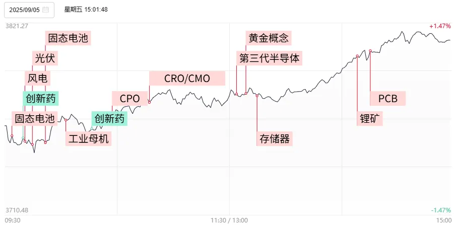 9月5日,市场全天震荡走高,创业板指领涨,沪指重新站上3800点。截至收盘,沪指涨1.24%,深成指涨3.89%,创业板指涨6.55%。