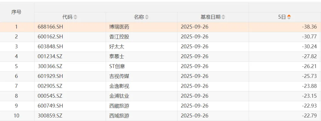 跌幅最大的10只个股分别为:博瑞医药、香江控股(600162)、好太太(603848)、泰慕士、ST 创意、吉视传媒(601929)、金逸影视(002905)、金浦钛业(000545)、西藏旅游(600749)、西域旅游。