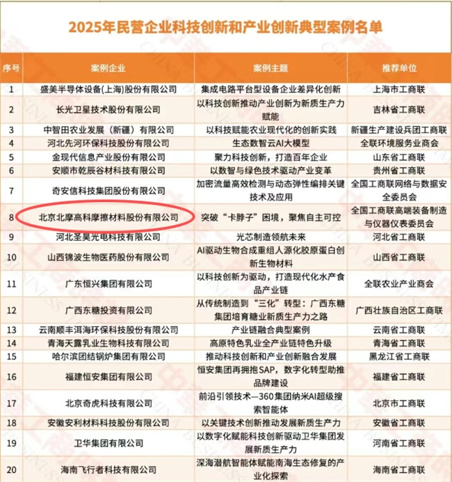 会上,全国工商联发布了《2025年民营企业科技创新和产业创新典型案例名单》。北摩高科(002985)凭借在航空航天关键技术领域的突出创新成果,荣获“新质生产力科技创新典型案例”奖项。全国政协副主席、全国工商联主席高云龙亲自为企业颁奖,充分肯定了北摩高科在推动产业升级与科技自立自强方面所做出的贡献,以及企业在解决刹车制动 “卡脖子”难题方面走出的自主创新道路。