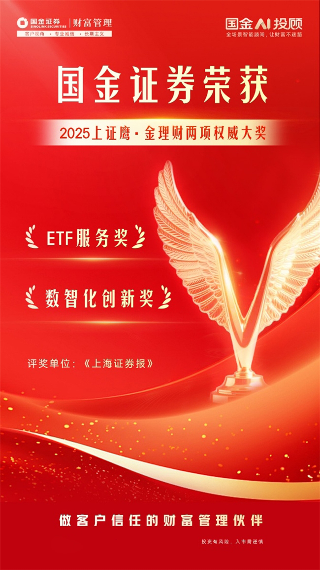 12月12日,在由《上海证券报》主办的2025“上证鹰·金理财”评选颁奖典礼上,国金证券(600109)凭借卓越的服务能力与品牌影响力,荣获“ETF服务奖”和“数智化创新奖”两项大奖,此次获奖是业界对国金证券业务始终坚持以客户为中心,深耕专业服务和科技创新的高度认可。