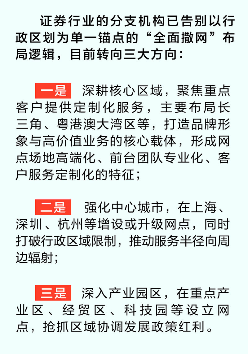 银河证券相关人士表示,证券行业的分支机构已告别以行政区划为单一锚点的“全面撒网”布局逻辑,目前转向三大方向:一是深耕核心区域,聚焦重点客户提供定制化服务,主要布局长三角、粤港澳大湾区等,打造品牌形象与高价值业务的核心载体,形成网点场地高端化、前台团队专业化、客户服务定制化的特征;二是强化中心城市,在上海、深圳、杭州等增设或升级网点,同时打破行政区域限制,推动服务半径向周边辐射;三是深入产业园区,在重点产业区、经贸区、科技园等设立网点,抢抓区域协调发展政策红利。