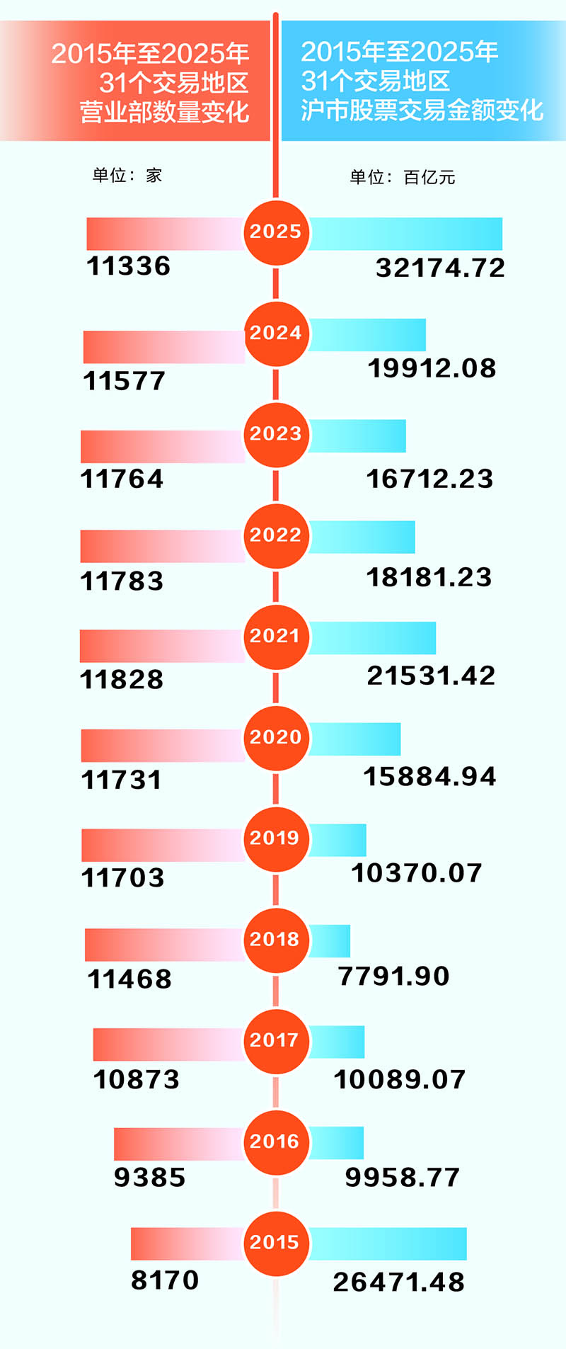 根据证券时报记者对上交所数据的统计,截至2025年末,内地31个交易地区的券商营业部总数为1.13万家,已回落至2018年水平。回顾过去十年,2015年共有8170家营业部,此后券商加大“跑马圈地”力度,2021年达到顶峰——1.18万家,6年时间增长40%。