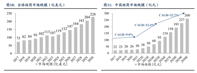 这种产业链层面的全球纵深布局,为远大医药竞逐全球核药市场奠定了坚实的基础。后续随着全球核药市场的持续扩容,远大医药或将凭借先发优势及完整产业链布局,在这一蓝海市场占据重要席位。据Precedence Research数据,2023年,全球核药市场规模为107亿美元,并将以11.5%的年复合增长率增长至2030年的228亿美元。