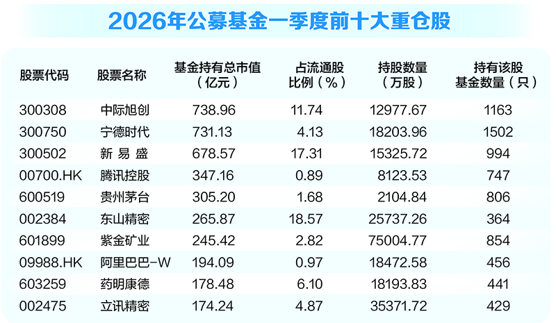 随着公募基金一季报全部披露完成,基金前十大重仓股数据正式浮出水面。以持有市值计算,一季度公募主动权益基金前十大重仓股分别为中际旭创(300308)、宁德时代(300750)、新易盛(300502)、腾讯控股、贵州茅台(600519)、东山精密(002384)、紫金矿业(601899)、阿里巴巴-W、药明康德(603259)、立讯精密(002475)。