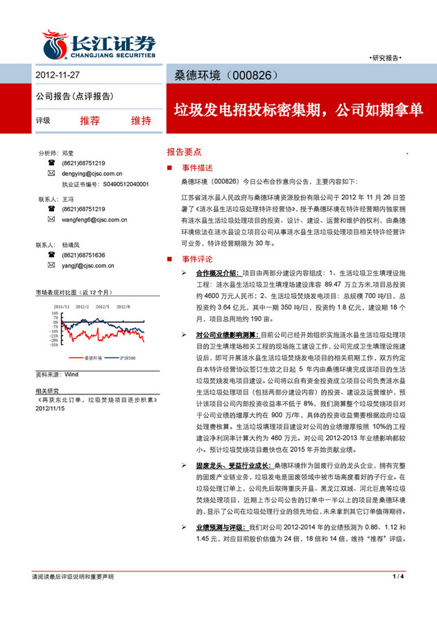桑德环境:获河北焚烧垃圾订单 推荐评级