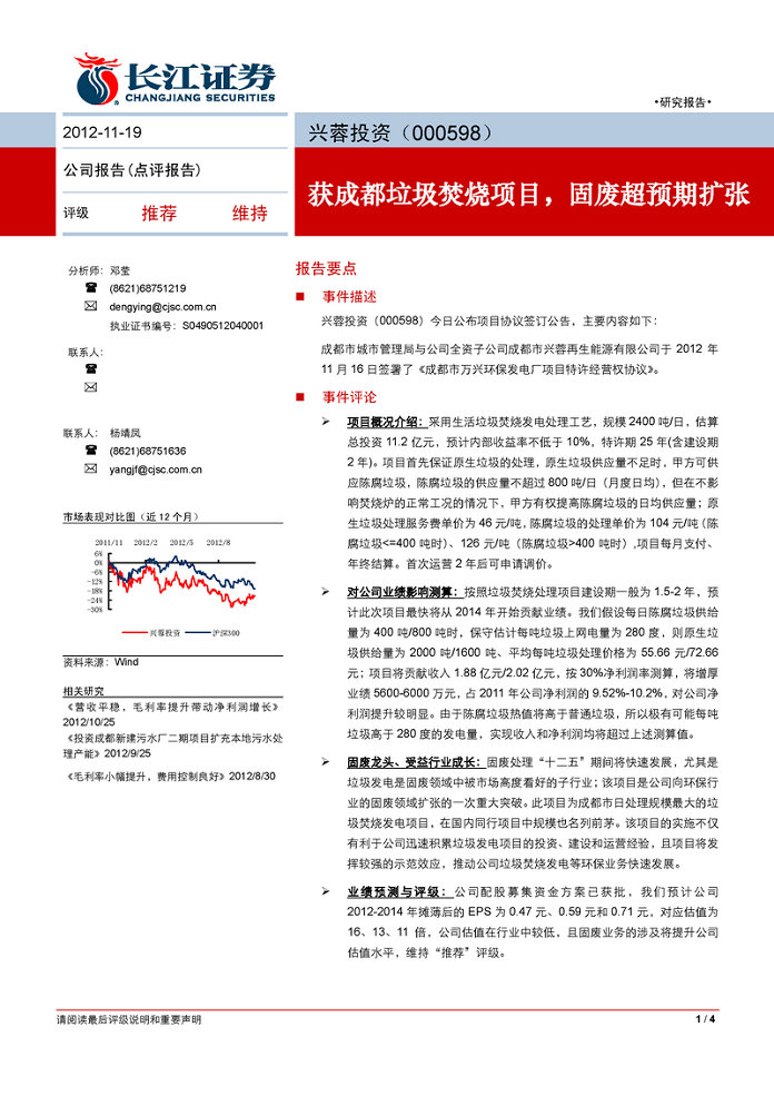 兴蓉投资:获成都垃圾焚烧项目 推荐评级