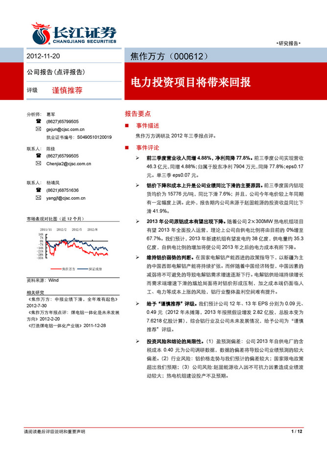 焦作万方:电力投资项目将带来回报 谨慎推荐