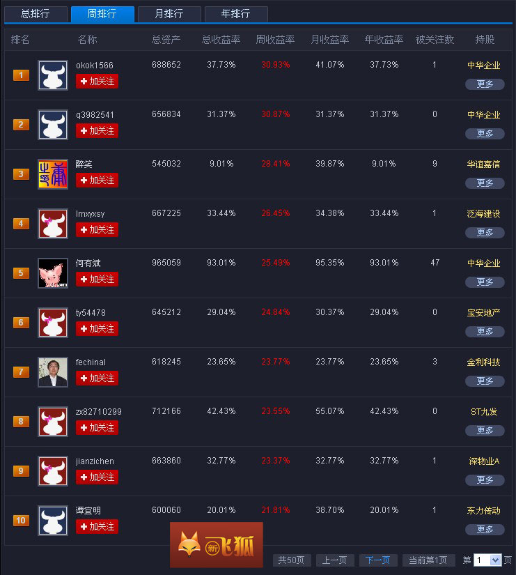 新飞狐模拟操盘周收益超过20%六大高手的持仓明细